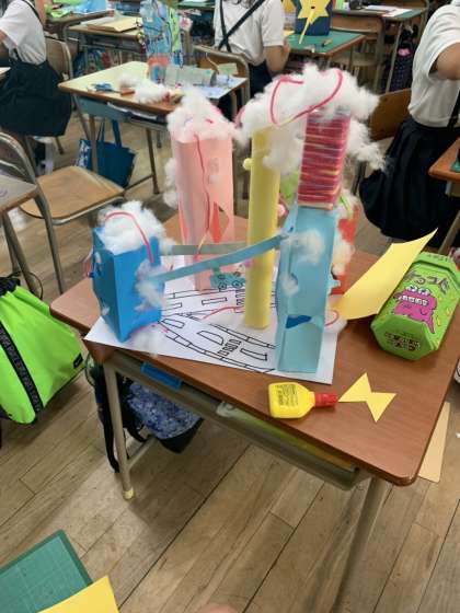 近未来型の都市を画用紙等を使って作成し、わたをつかって雲を表現してみたり、ユニークが作品がたくさん完成しました。