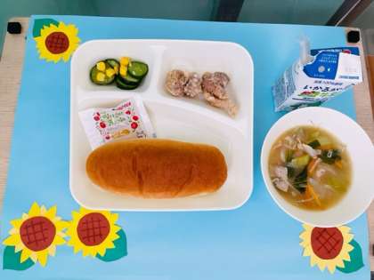 鶏肉のからあげ、中華みそスープ、きゅうりとコーンのサラダ、コッペパン、りんごジャム、牛乳