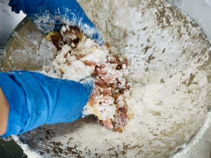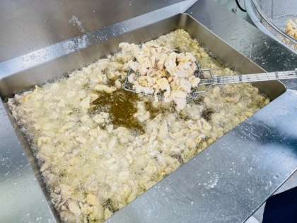 給食室で鶏肉のからあげを作っているようすです。下味をつけた鶏肉にでんぷんをまぶし、あぶらであげます。