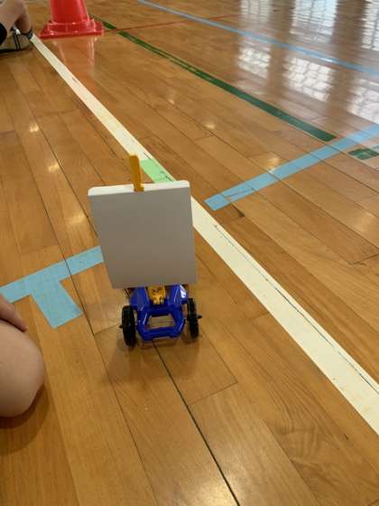講堂では、理科の学習で学んだ「風とゴムの力のはたらき」の実験道具で、車を走らせる競争をしていました。
