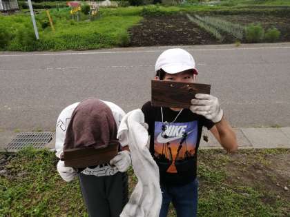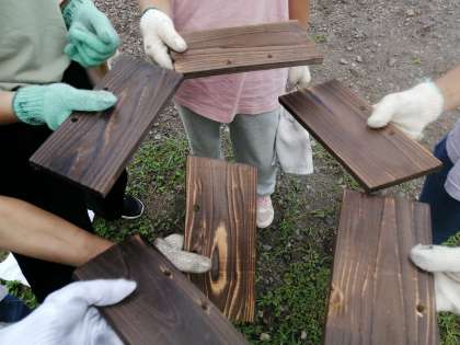 焼いた板についたススを古タオルと軍手でゴシゴシ磨きます。