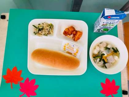 ヤンニョムチキン、もやしととうふのスープ、切干しだいこんのナムル、コッペパン、牛乳