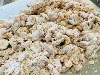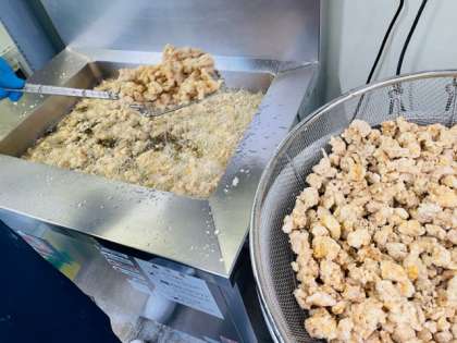 給食室でヤンニョムチキンを作っているようすです。大阪市の給食に初登場です。あげた鶏肉に、コチジャン、こいくちしょうゆ、ケチャップ、料理酒、みりんで作ったたれをからめます。