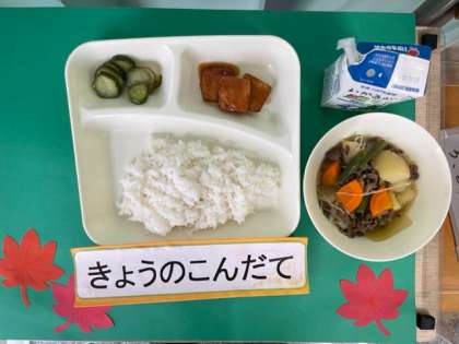 肉じゃが、あつあげのみそだれがけ、きゅうりのゆずの香あえ、ごはん、牛乳