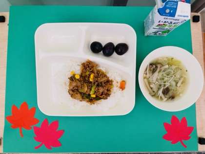 野菜たっぷりカラフルライス、キャベツときのこのスープ、ぶどう(巨砲)、牛乳