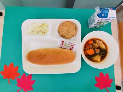 チキンレバーカツ、ケチャップ煮、キャベツのバジル風味サラダ、コッペパン、りんごジャム、牛乳