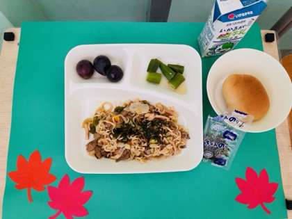 焼きそば、オクラの甘酢あえ、ぶどう(巨峰)、黒糖パン1/2、牛乳