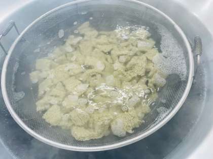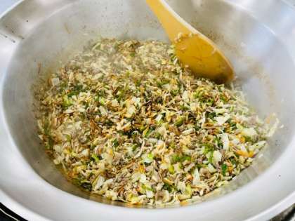 給食室で焼きそばを作っているようすです。豚肉、いか、キャベツ、たまねぎ、ピーマン、にんじんが入った具だくさんの焼きそばです。乾燥させた中華めんを使用しているので、茹でてからいためています。きざみのりをかけて食べます。