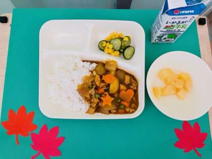 チキンカレーライス[米粉]、きゅうりとコーンのサラダ、白桃(カット缶)、牛乳