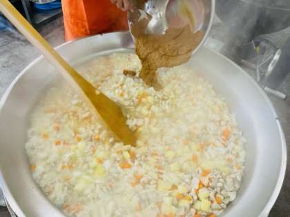給食室でチキンカレーライスを作っているようすです。米粉のカレールウの素を使用しているので、小麦アレルギーの児童も食べることができます。ラッキーにんじんが入っています。