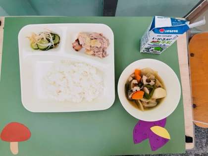 豚肉のねぎじょうゆ焼き、ふきよせ煮、きゅうりともやしの甘酢あえ、ごはん、牛乳