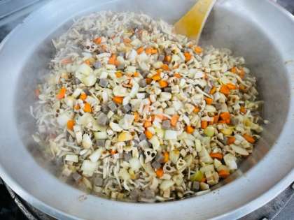 給食室でふきよせ煮を作っているようすです。鶏肉、こんにゃく、さといも、たまねぎ、れんこん、にんじん、さんどまめ、しめじが入った具だくさんの煮ものです。
