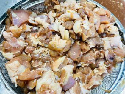 給食室で鶏肉のたつたあげを作っているようすです。しょうが、料理酒、こいくちしょうゆで下味をつけた鶏肉にでんぷんをまぶし、あぶらであげます。