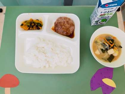 和風ハンバーグ、みそ汁、かぼちゃのいとこ煮、ごはん、牛乳