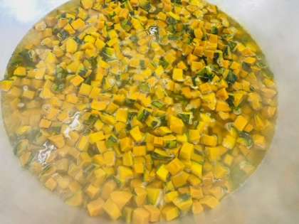給食室でかぼちゃのいとこ煮を作っているようすです。いとこ煮にはあずきが使われており、カルシウム、鉄、食物繊維などが多く含まれています。