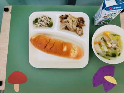 豚肉のカレー風味焼き、はくさいのスープ、もやしとピーマンのいためもの、おさつパン、牛乳