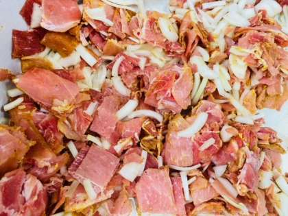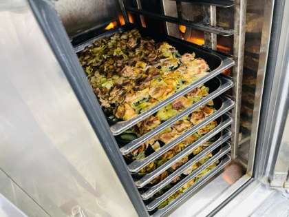 給食室で豚肉のカレー風味焼きを作っているようすです。ワイン、塩、こしょう、カレー粉、綿実油で下味をつけた豚肉とたまねぎを混ぜ合わせ、焼き物機で焼きます。