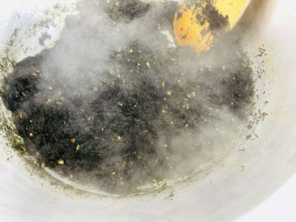 給食室でのりのつくだ煮を作っているようすです。だしと調味料を合わせてしいたけを煮ます。きざみのりを加え、しばらく煮つめるとつくだ煮ができます。