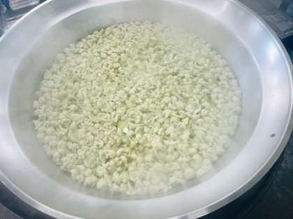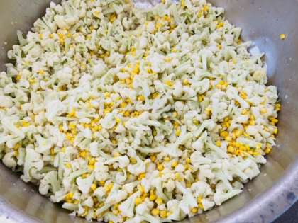 給食室でカリフラワーのピクルスを作っているようすです。カリフラワーとコーンをゆで、砂糖、塩、ワインビネガーを合わせたたれをかけます。