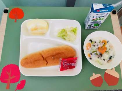 きのこのクリームシチュー、キャベツのピクルス、りんご、コッペパン、いちごジャム、牛乳