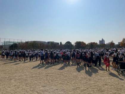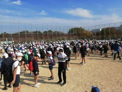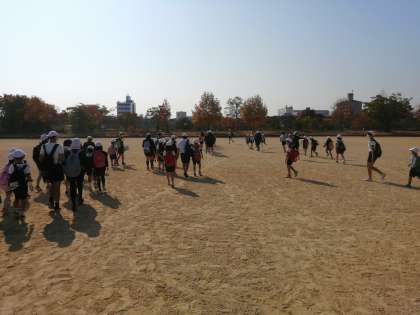 緑地公園で縦割り班に分かれてクイズや問題にチャレンジします。