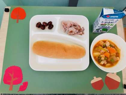 豚肉のガーリック焼き、ケチャップ煮、うずら豆のグラッセ、コッペパン、バター、牛乳