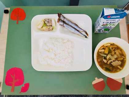 焼きししゃも、和風カレー汁、まいたけとキャベツのいためもの、ごはん、牛乳