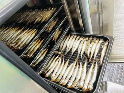 給食室で焼きししゃもを作っているようすです。ホテルパン(鉄板)に網をのせ、その上にししゃもを並べます。焼き物機で焼きます。