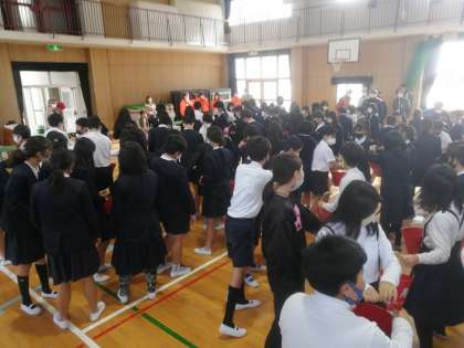 4・5・6年生は、最後に講堂でバケツリレーの練習を体験しました。残念ながら水は無しで行いました。