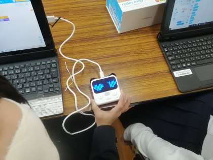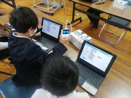 初めにプログラミング学習についてのルールや操作方法の説明を聞き、タブレット端末をつかって学習に取り組みました。