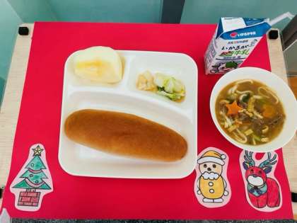 カレーうどん、はくさいのおひたし、りんご、黒糖パン、牛乳
