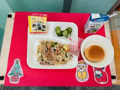 和風焼きそば、きゅうりのしょうがづけ、いり黒豆、1/2黒糖パン、牛乳