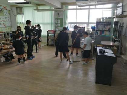 今日の5時間目を使って、たてわり班そうじをしましたよ。高学年と低学年がペアになり学校を掃除する行事です。