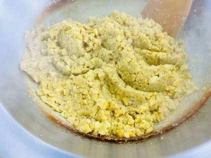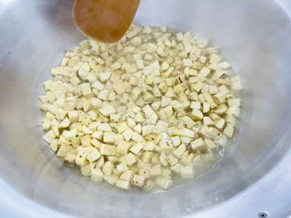給食室でくりきんとんを作っているようすです。さつまいもとくりを煮て、砂糖、みりん、塩で味付けします。さつまいもが程よくくずれるまで煮ます。