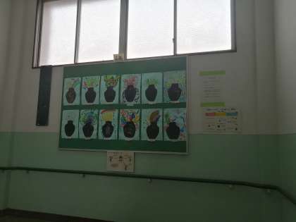 北階段を上がっていると2年生の図画工作科の絵画が展示していました。