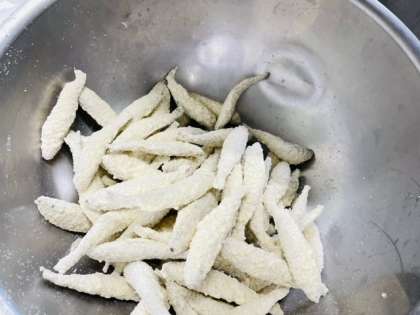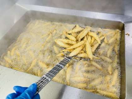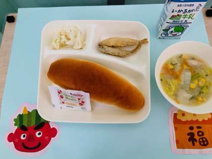 わかさぎフライ、コーンとはくさいのスープ、カリフラワーのサラダ、コッペパン、りんごジャム、牛乳