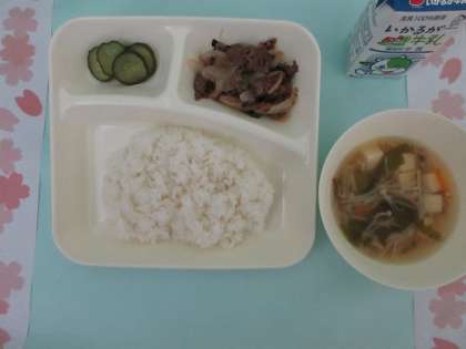 プルコギ、とうふとわかめのスープ、きゅうりの甘酢づけ、ごはん、牛乳
