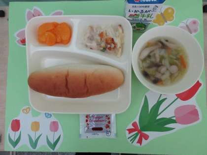 マカロニグラタン、キャベツのスープ、みかん(缶)、いちごジャム、コッペパン、牛乳