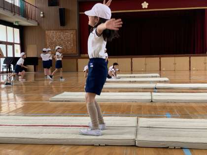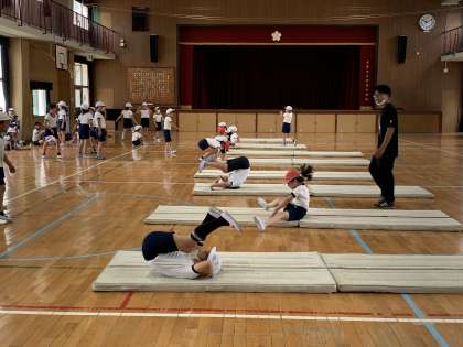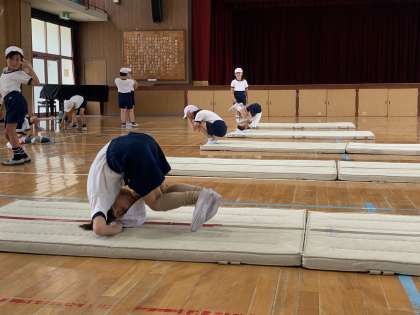 マット運動の様子です。前転や後転にチャレンジしています。