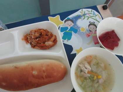 7月7日(金) おさつパン、牛乳、なすのミートグラタン、スープ、ダイスゼリー(ぶどう) です。