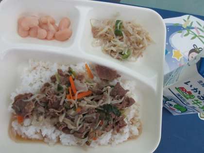 7月10日(月) ごはん、牛乳、牛丼、もやしとピーマンのごまいため、大福豆の煮もの です。