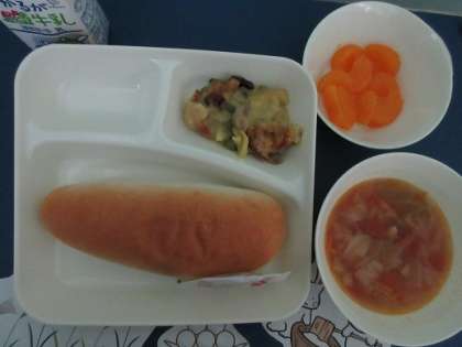コッペパン、牛乳、豆乳マカロニグラタン【米粉】、トマトスープ、みかん(缶)、りんごジャム