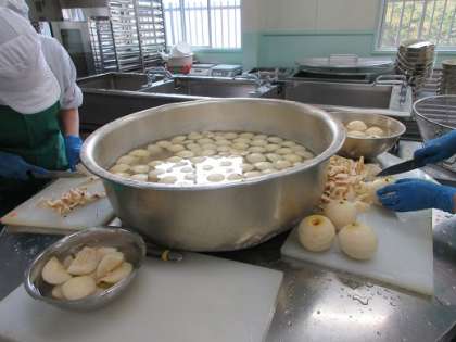 調理員さんが一つひとつ丁寧に皮をむき、子どもたちが食べやすいようカットしています。