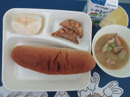 こくとうパン、牛乳、あげぎょうざ、鶏肉ととうがんの中華煮、なし(二十世紀)