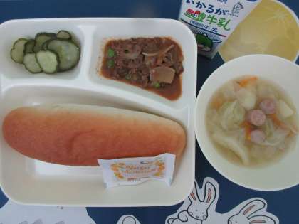 コッペパン、牛乳、牛肉のデミグラスソース煮、スープ、きゅうりのピクルス、マーマレード