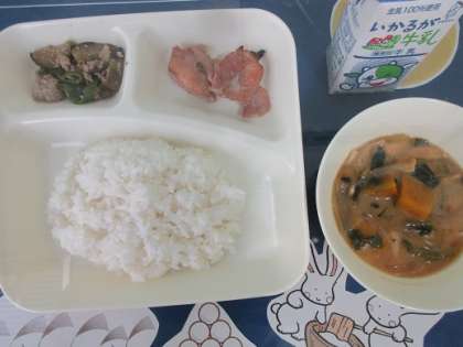ごはん、牛乳、鶏肉のてり焼き、かぼちゃのみそ汁、なすのそぼろいため
