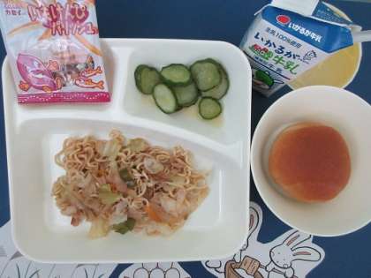 1/2パン、牛乳、焼きそば、きゅうりのしょうがづけ、いもけんぴフィッシュ