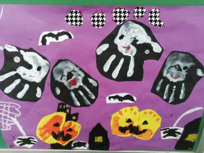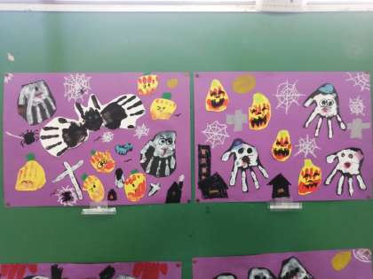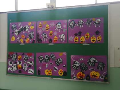2年生の階段掲示と教室に背面掲示にオバケの大集合を見ました。