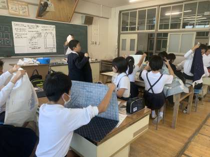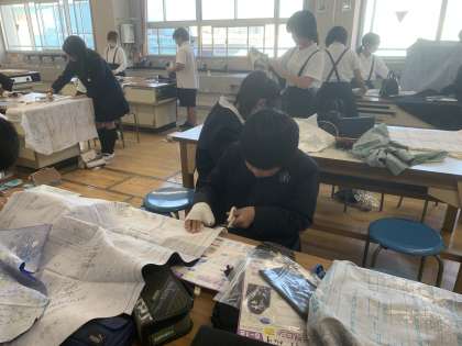 裁ちばさみを使って布を切り、アイロンを使ってしつけをしました。