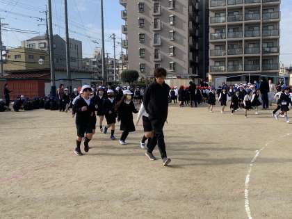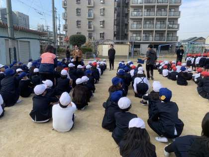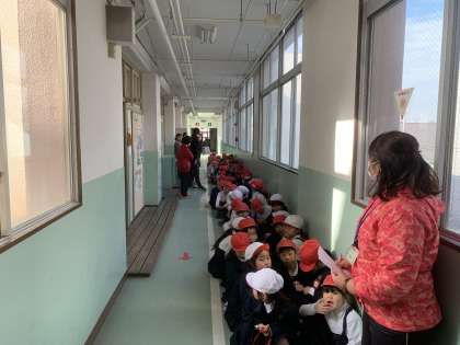 一次避難で校舎内にいる児童は机の下へ入り、運動場にいる児童は、その場でしゃがんで頭を守りました。